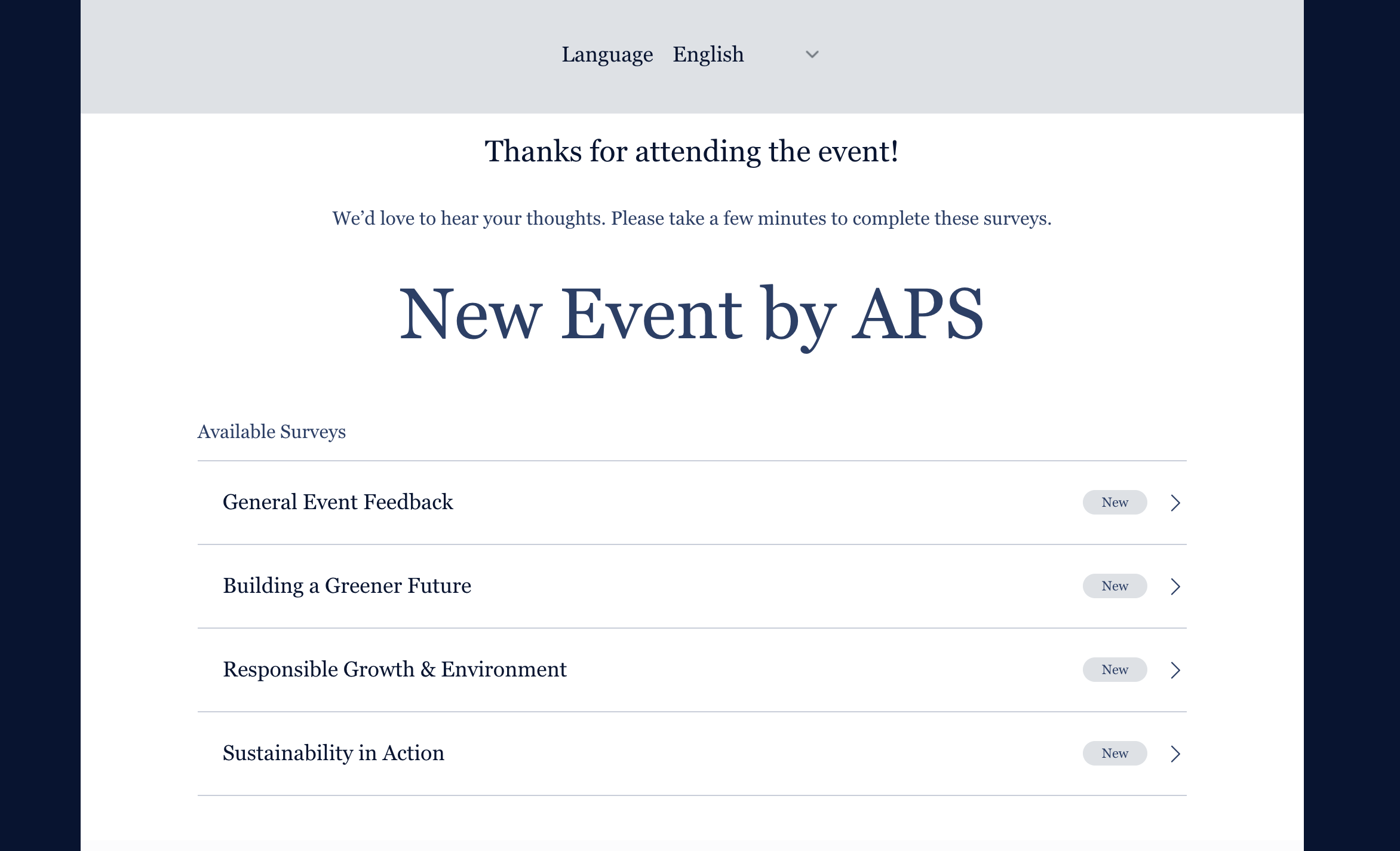 Alphabetical Sorting: Session surveys will now be displayed in alphabetical order, allowing attendees to find their desired surveys without unnecessary scrolling or searching.