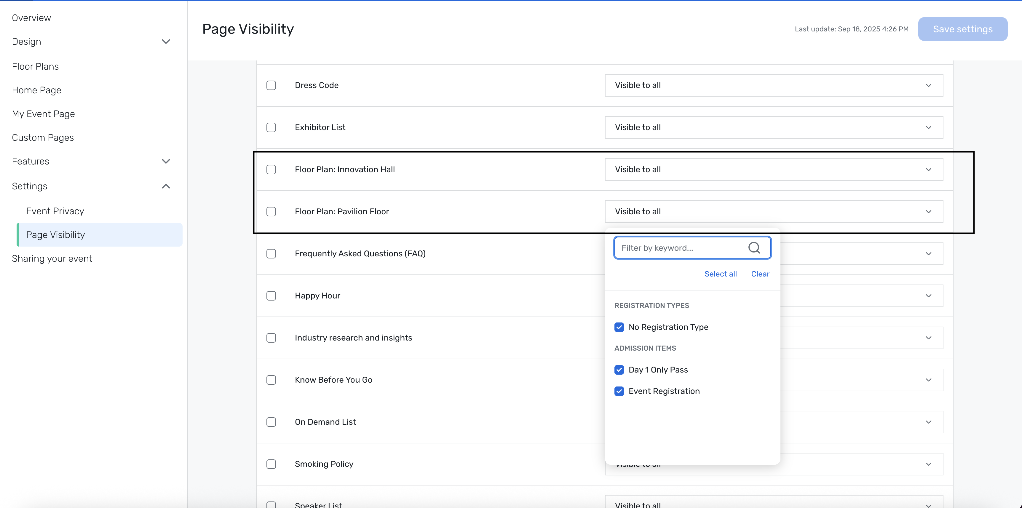 What's Changed: New per–floor plans visibility controls within the App Builder’s Page Visibility UI (Visible to all, or rules by Admission Item, Registration Type, and Audience Segments).