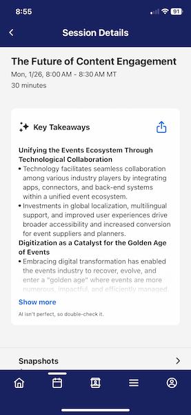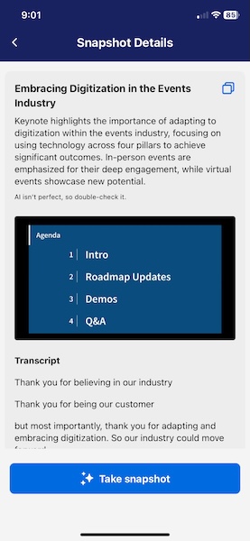 What's Changed: The Snapshots feature increases attendee engagement by streamlining note-taking during in-person sessions. Attendees simply click on the "Take snapshot" button in the Event App, and a few moments later, a Snapshot is generated. Each Snapshot includes an image of the slide displayed on stage and a snippet of transcript corresponding to that moment, including an AI-generated title and brief summary.