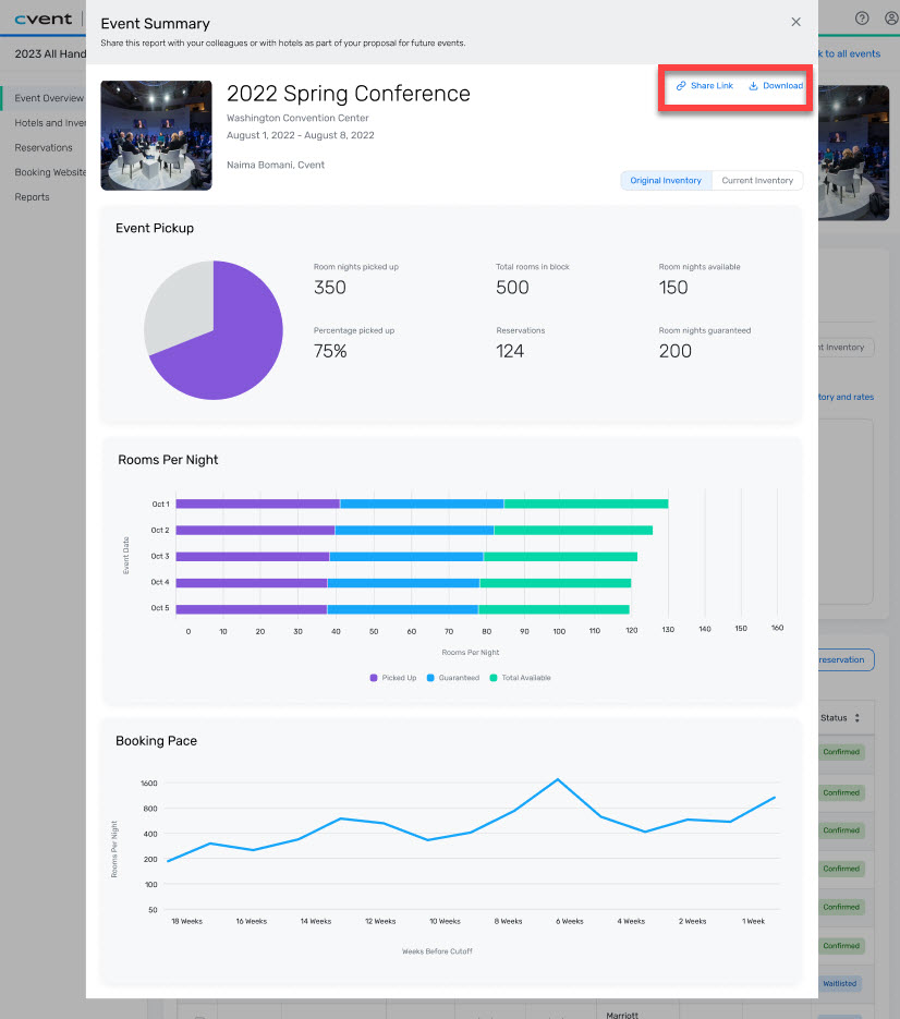 Click the Share link to generate a URL you can send to anyone. Recipients do not need a Planner Portal account to view the summary, and their access is limited to the key event metrics shown in the modal. They won’t be able to navigate to other events or access additional pages within the Planner Portal.