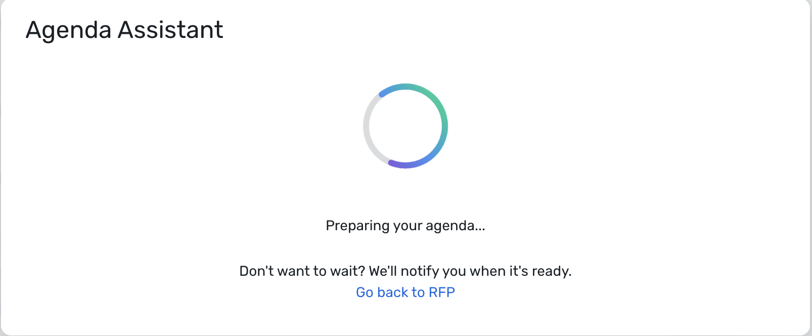 You can return to the RFP to add other details while the Assistant processes your input, or stay on this page. If you go back, you’ll receive a notification when your agenda is ready to review and add to the form: