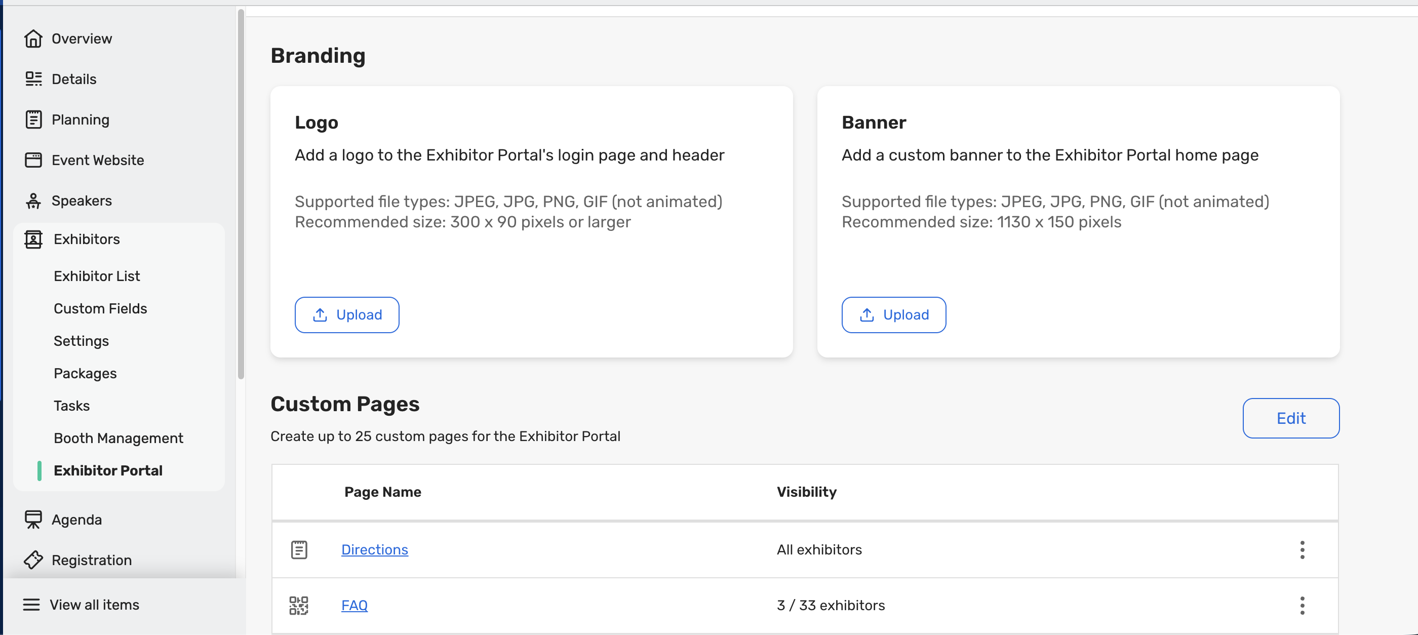 The Exhibitor Portal Logo and Banner options are now consolidated within the Exhibitor Portal tab alongside the new Custom Pages feature for easier access and management