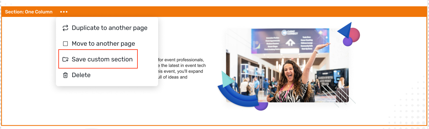 Custom Sections Library: Save your custom-designed sections once and reuse them across your events within the same account for a more consistent, on-brand experience.
