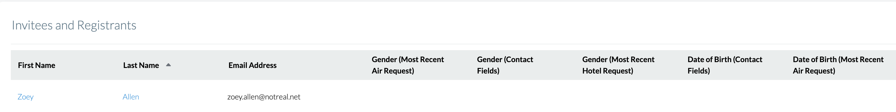 If a report contains Date of Birth from an invitee's contact fields and the most recent air request, the report grid will display them as:
