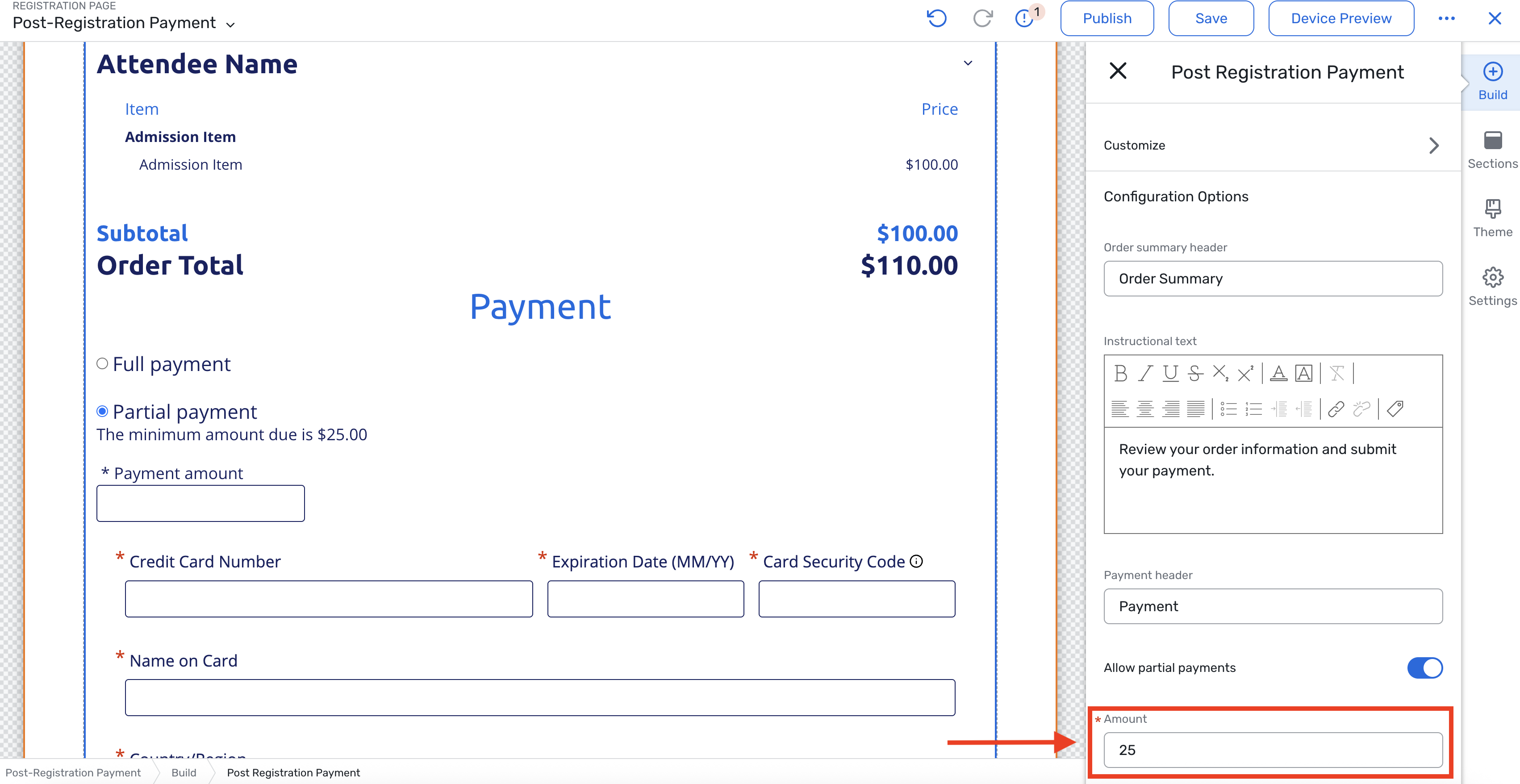 By default, the Post-Registration Payment widget still inherits the partial payment minimum from the main registration payment widget, just like today. If planners don’t update the value, it will remain consistent with updates on the registration payment widget.