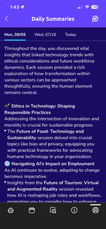 On the same Daily Sessions card, Session Takeaways give her a concise, AI-generated summary of the entire session. Even for sessions she didn’t attend, she gets a quick, digestible recap of the key points and a summary of the entire session. Even for sessions where she didn’t take a snapshot, she gets a quick, digestible recap of the key points.
