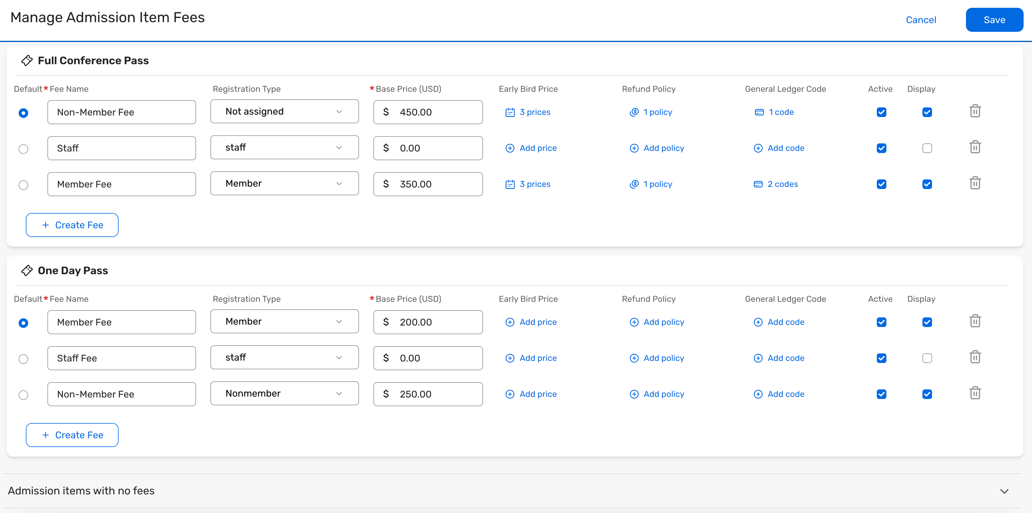 In the Manage Fees view, Emma can update multiple fees at once and immediately see how they correspond to each registration type. The redesigned layout makes even complex pricing structures easier to understand.
