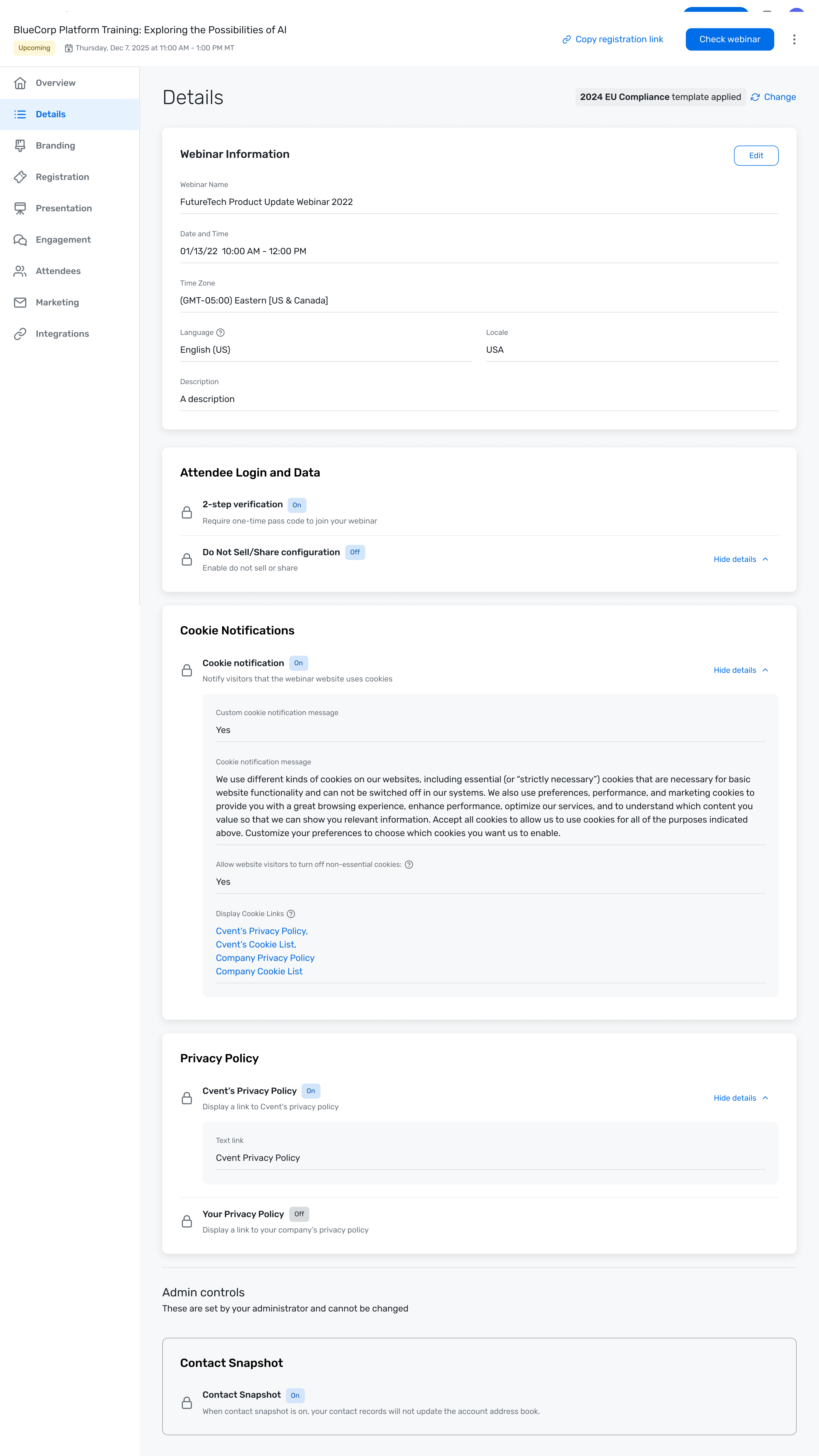 Administrators can enable Contact Snapshot by updating the Data/Privacy template. The feature is off by default to prevent unintended behavior. Once enabled, it applies to new events created after the template update; existing events remain unchanged.Template-driven activation for events