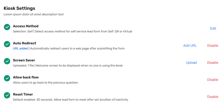 Configure more settings that control how the kiosk itself functions. You’ll be able to choose between a scrolling lead form or page-by-page questions layout, and configure kiosk behavior in one place with options for the reset timer, screen saver, back button, and auto-redirects from the Kiosk Settings section.
