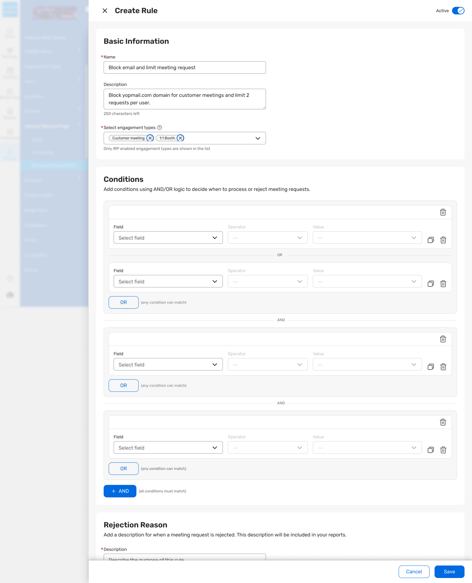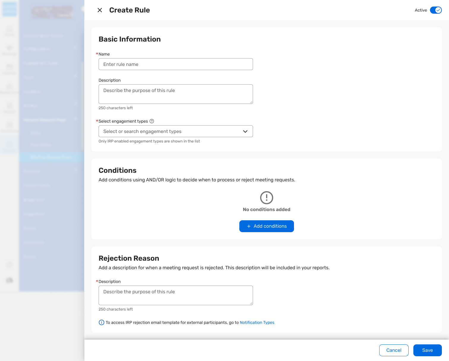 Meeting Managers can define, edit, and apply rules directly in the UI with support for multiple rules, AND/OR logic, and engagement‑type scoping