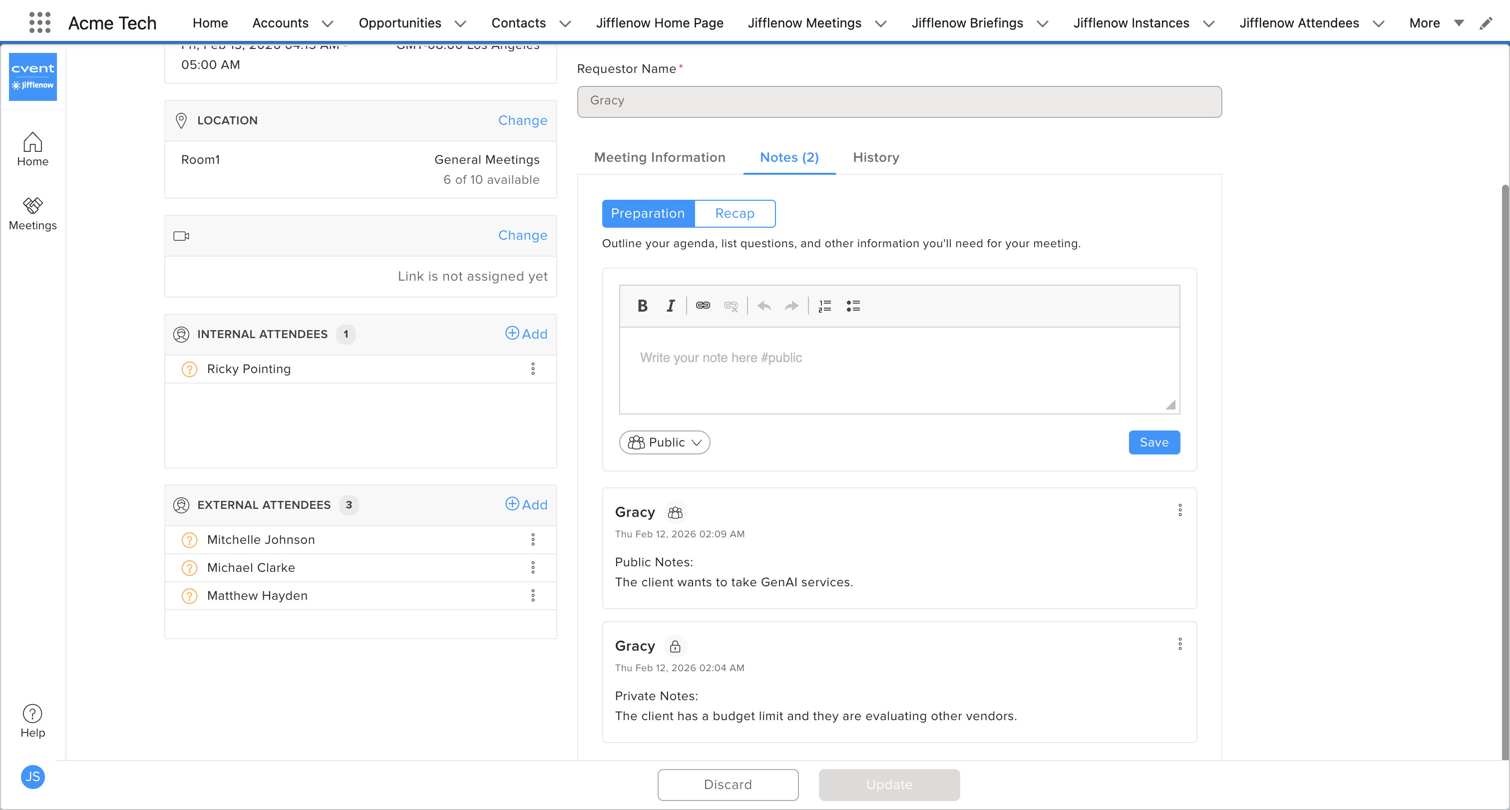 Public prep and recap notes are synced to the Salesforce Jifflenow Meeting record, so anyone viewing the record understands why the meeting was booked, what happened, and what’s next.
