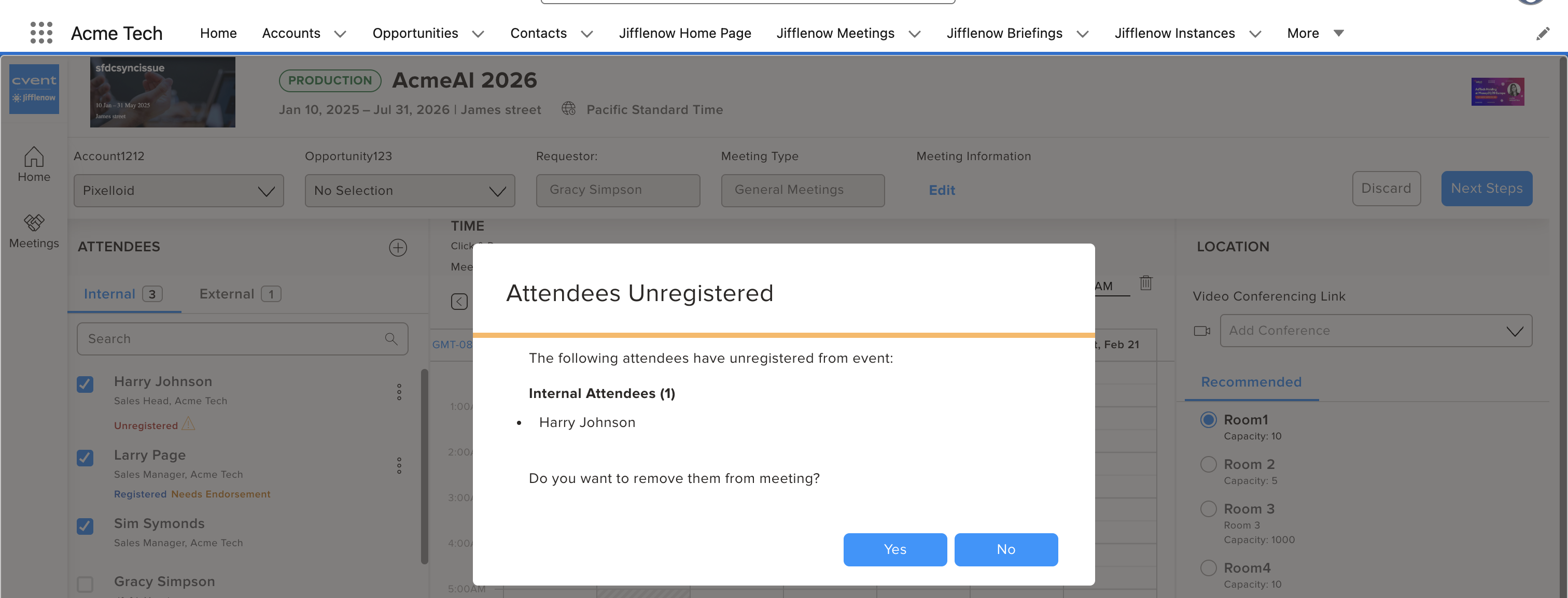 Jifflenow Salesforce App now shows clear alerts when a meeting contains unregistered attendees, so requestors immediately know which meetings are at risk.
