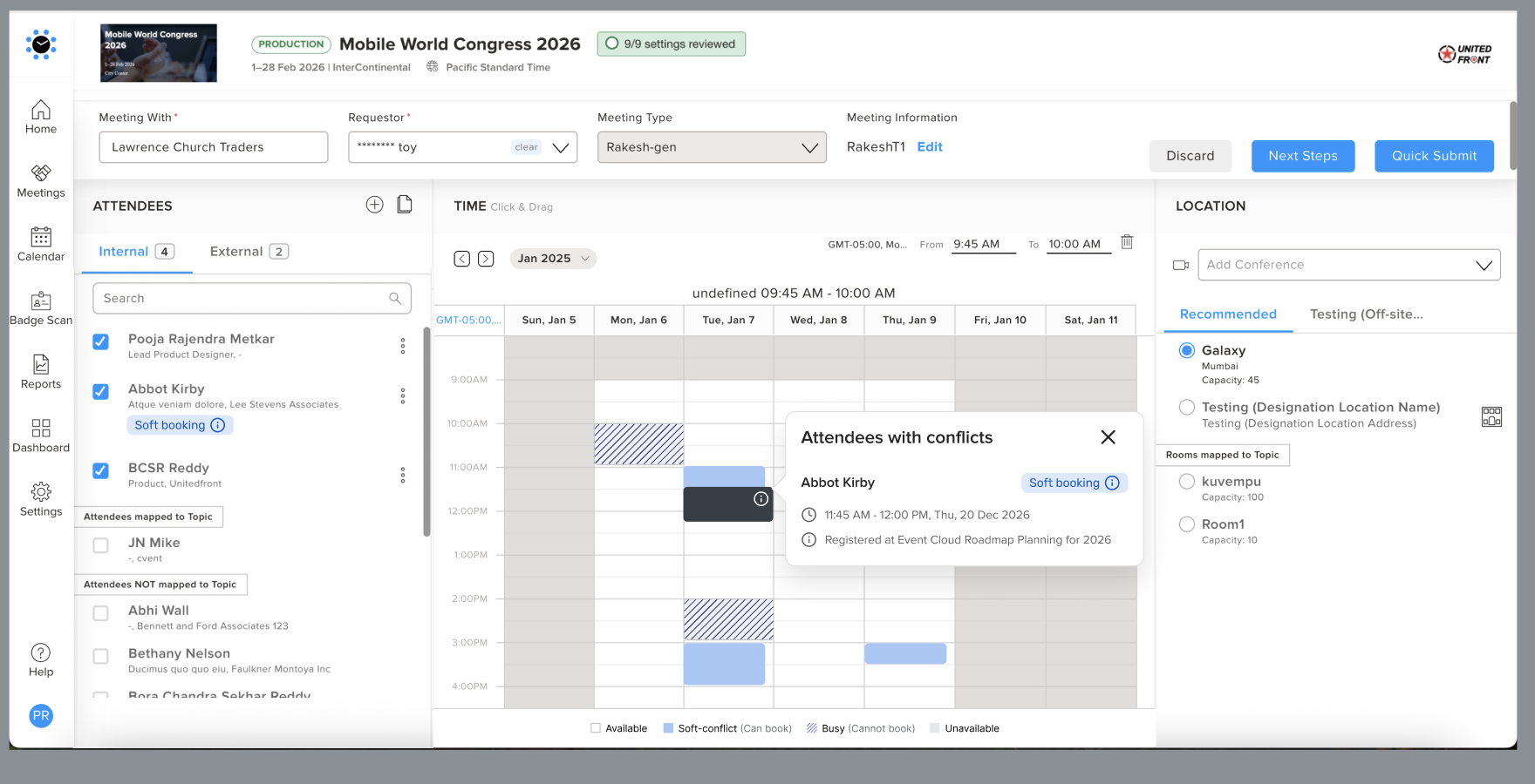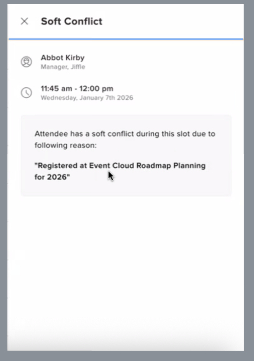 We’re introducing Soft Blocks in the Jifflenow platform to give schedulers more flexibility while still keeping visibility into potential conflicts. With this enhancement, meeting requestors can book meetings even when there are external calendar conflicts (including Cvent sessions and external calendar blocks), with clear indicators of any overlaps.