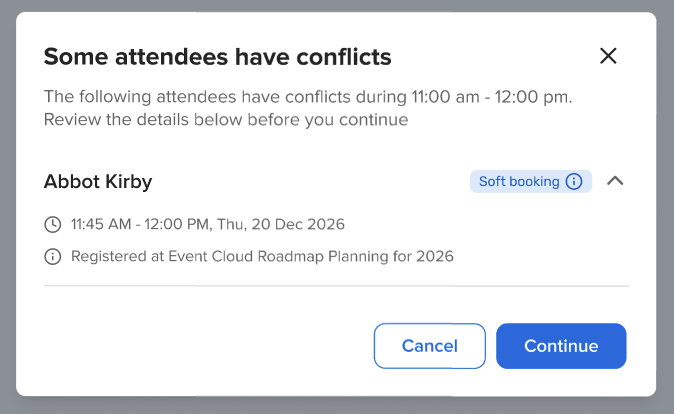 When a time slot has conflicts, users see a clear confirmation step before finalizing the meeting.Soft blocks in the Master Calendar