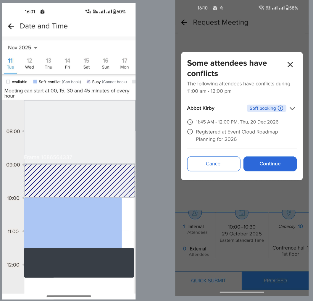 Soft blocks in Request Meeting: Soft block indicators appear directly in the Request Meeting flow so schedulers can see conflicts at the moment of booking.