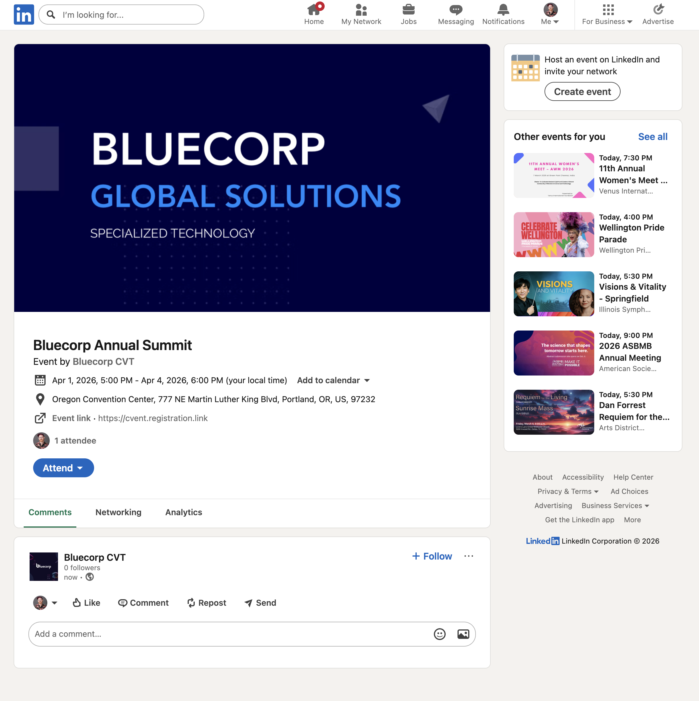 Keep core event details consistent between Cvent and LinkedIn, with Cvent as the source of truth.