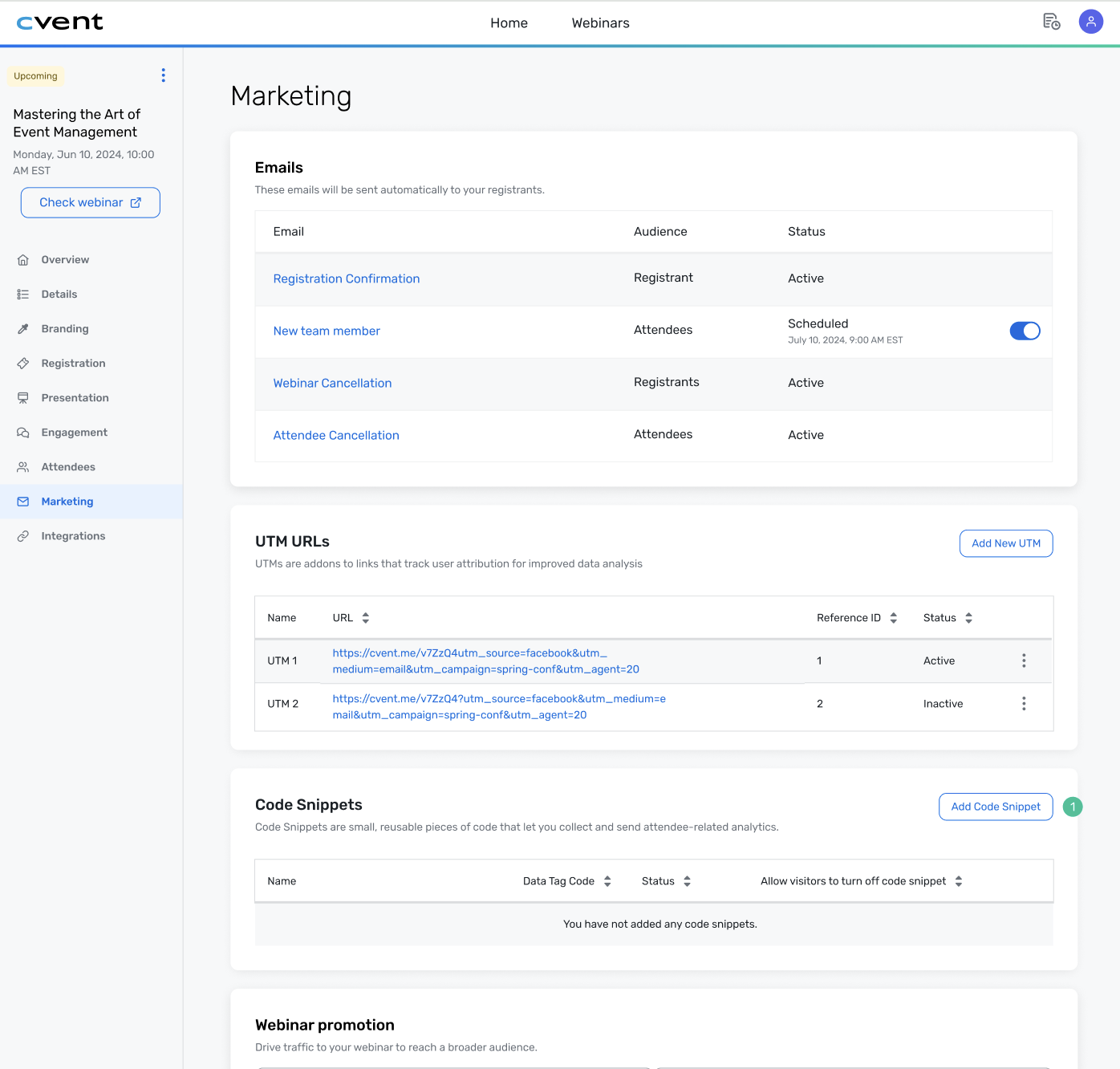 Generate UTM parameters directly in Webinar at the event level under the Marketing tab, instead of relying on external tools.