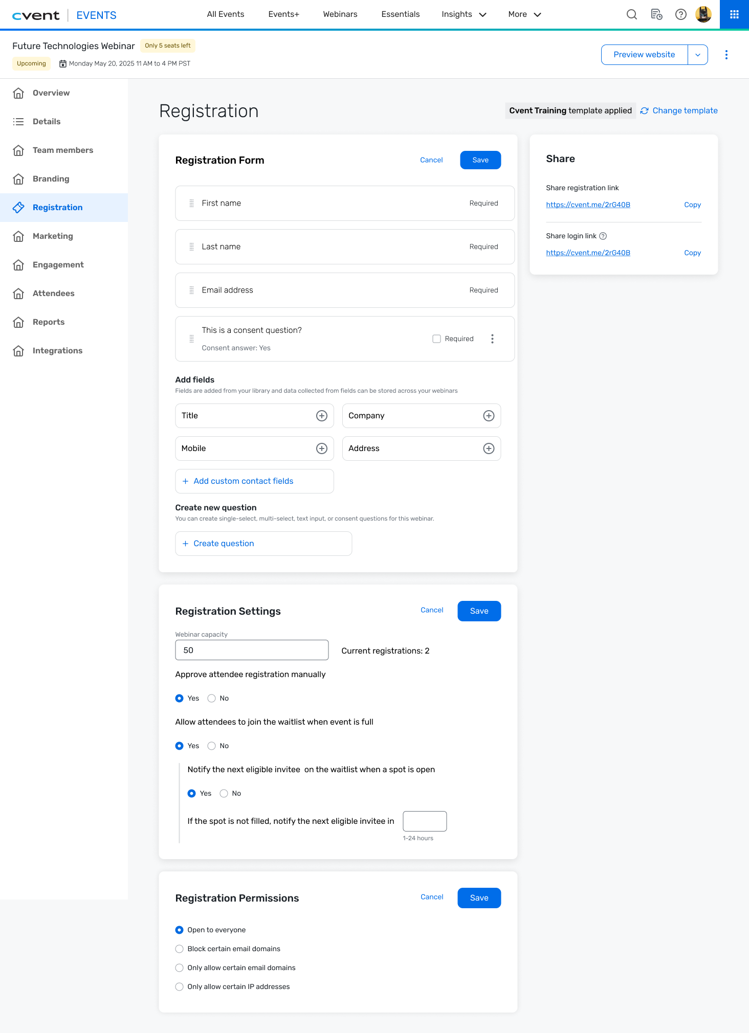 Easily manage limited-capacity events with a built-in waitlist in Cvent Essentials and Cvent Webinar. When an event reaches capacity, organizers can capture additional registrations and automatically promote attendees from the waitlist as spots open up due to cancellations.